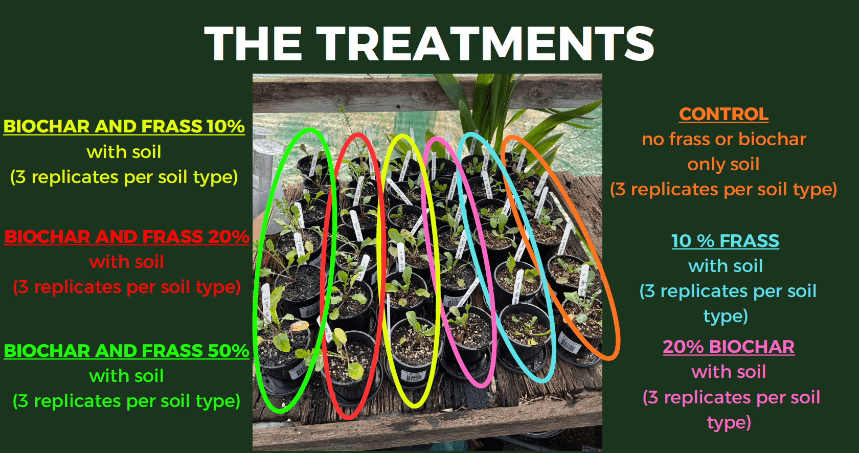 We tested various ratios, including a control group, frass-only (10% volume), biochar-only (20% volume), and combined mixtures at 10%, 20%, and 50% volume. We “loaded” the biochar by soaking it with frass in water for 2 hours prior to planting. Over seven weeks, we measured shoot height, leaf colour, root length, and soil nutrient composition.